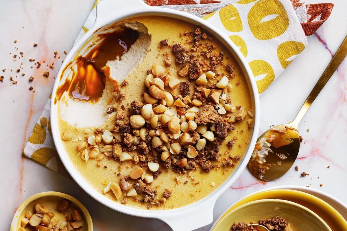 To make the chocolate crumble, scatter chocolate on prepared tray and bake, stirring halfway, for 10-12 minutes until light golden. Stand for 5 minutes to cool, then crumble the chocolate into small pieces and combine with macadamia. Scatter over pudding just before ddserving.